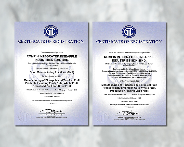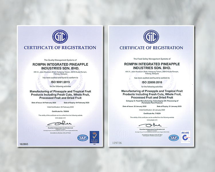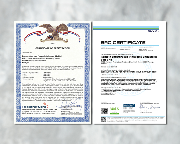 Our manufacturing facilities have achieved a series of accreditations such as Ministry of Health Malaysia GMP, Ministry of Health Malaysia HACCP, GIC ISO9001:2015, GIC ISO22000:2018, MESTI, MyFoodTAG, HALAL, Kosher, USFDA and BRCGC certification to reflect our commitment.